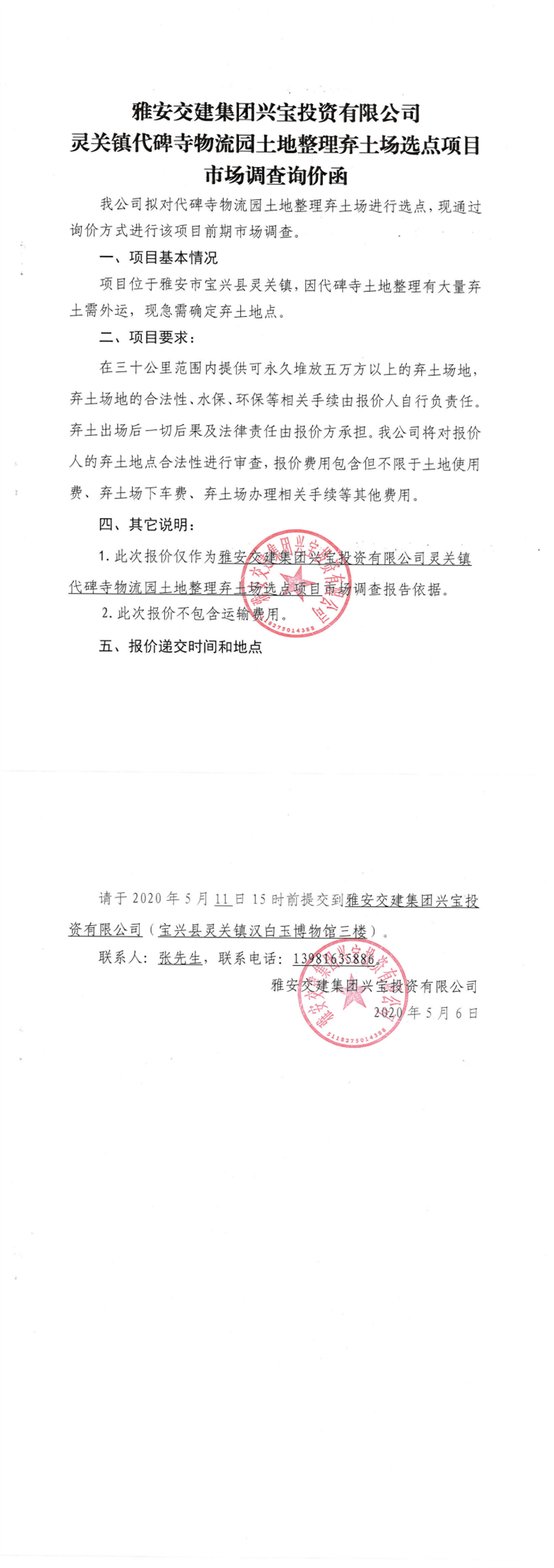 大红鹰dhy(中国)集团兴宝投资有限公司灵关镇代碑寺物流园土地整理弃土场选点项目市场调查询价函