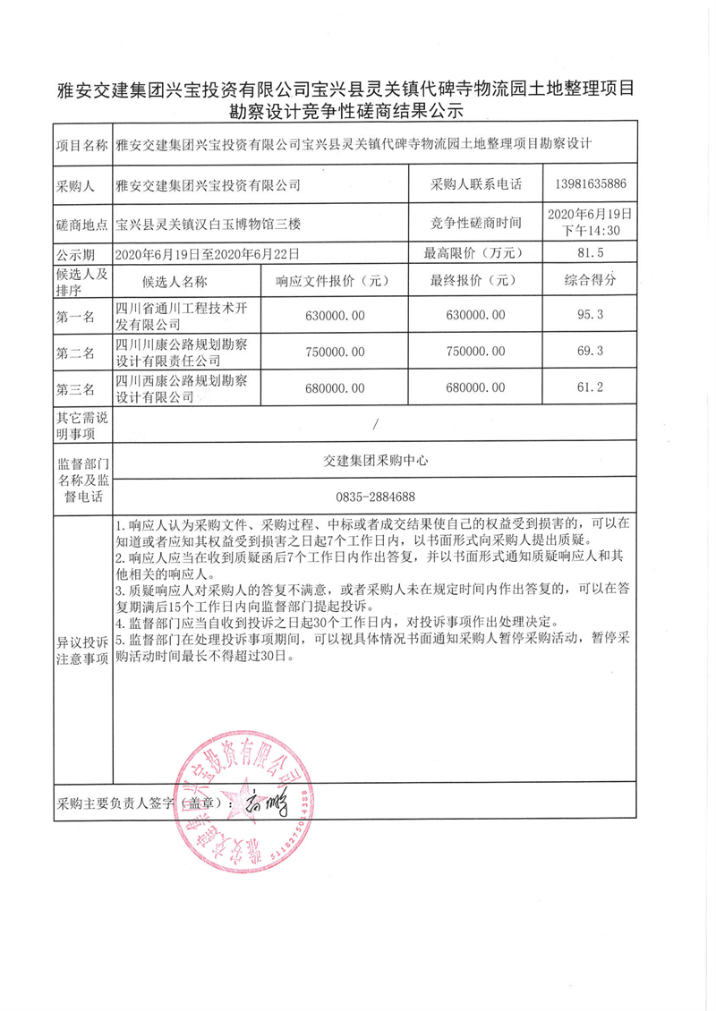 大红鹰dhy(中国)集团兴宝投资有限公司宝兴县灵关镇代碑寺物流园土地整理项目勘察设计竞争性磋商结果公示