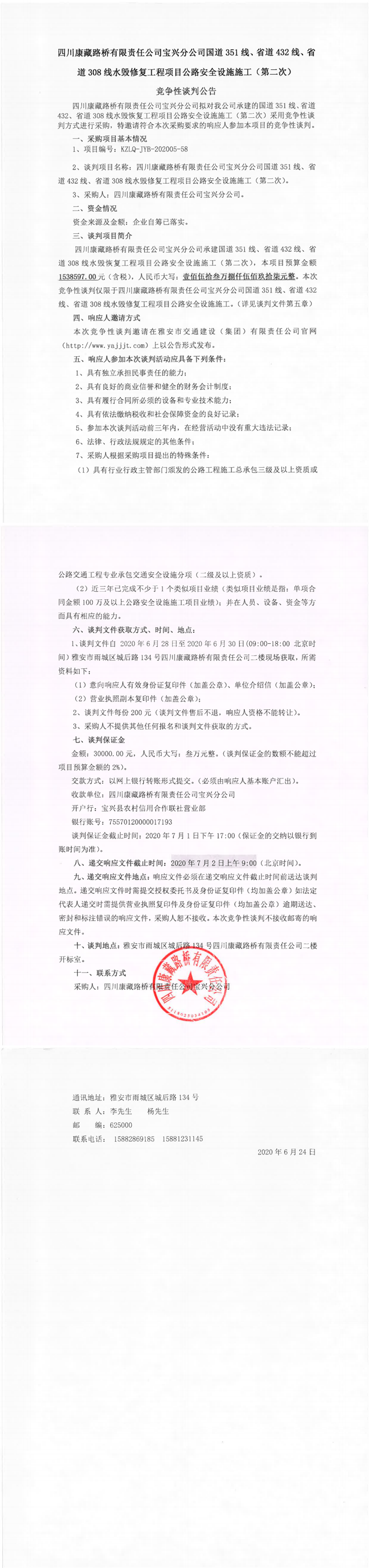 四川康藏路桥有限责任公司宝兴分公司国道351线、省道432线、省道308线水毁修复工程项目公路安全设施施工(第二次)竞争性谈判公告