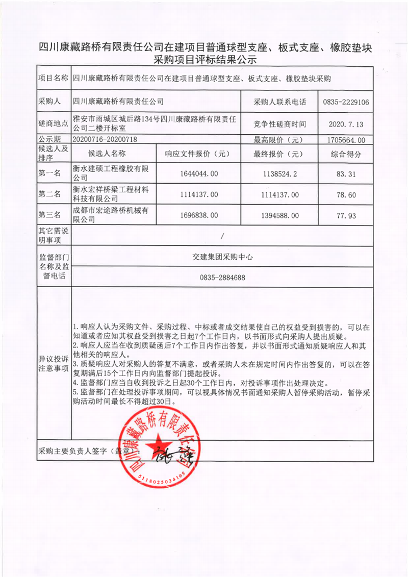 四川康藏路桥有限责任公司在建项目普通球型支座、板式支座、橡胶垫块采购项目评标结果公示