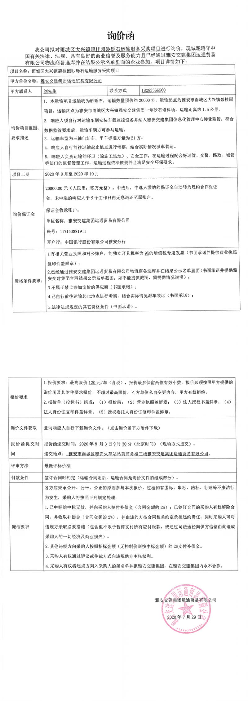 大红鹰dhy(中国)集团运通贸易有限公司雨城区大兴镇碧桂园砂砾石运输服务采购项目(第二次)询价函
