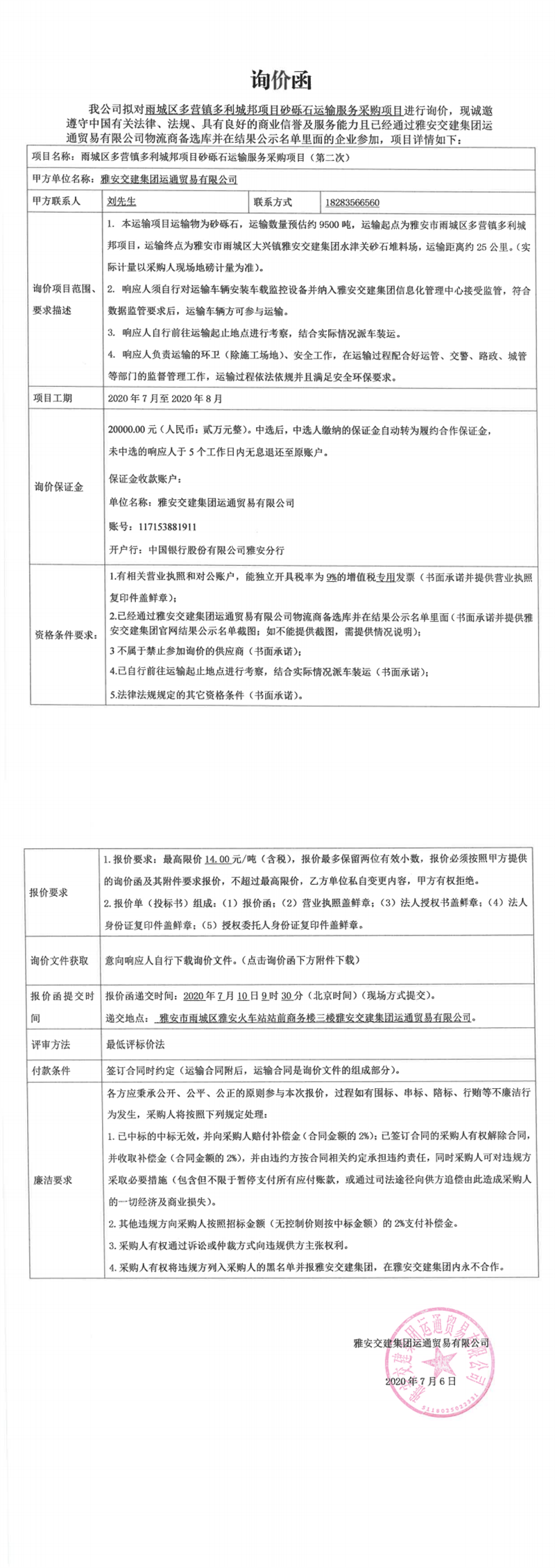 大红鹰dhy(中国)集团运通贸易有限公司雨城区多营镇多利城邦项目砂砾石运输服务采购项目(第二次)询价函