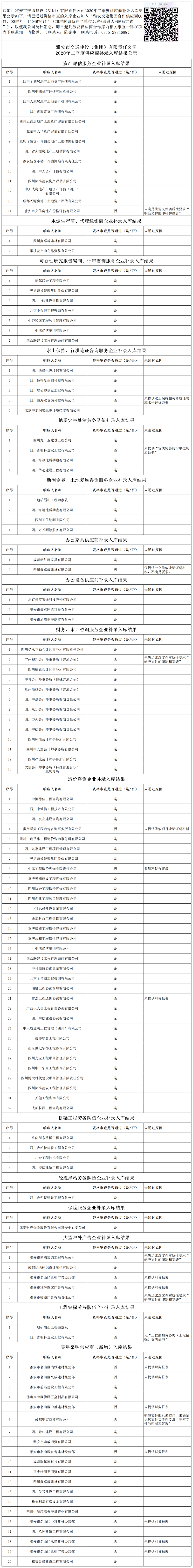 雅安市交通建设(集团)有限责任公司2020年二季度供应商补录入库结果公示