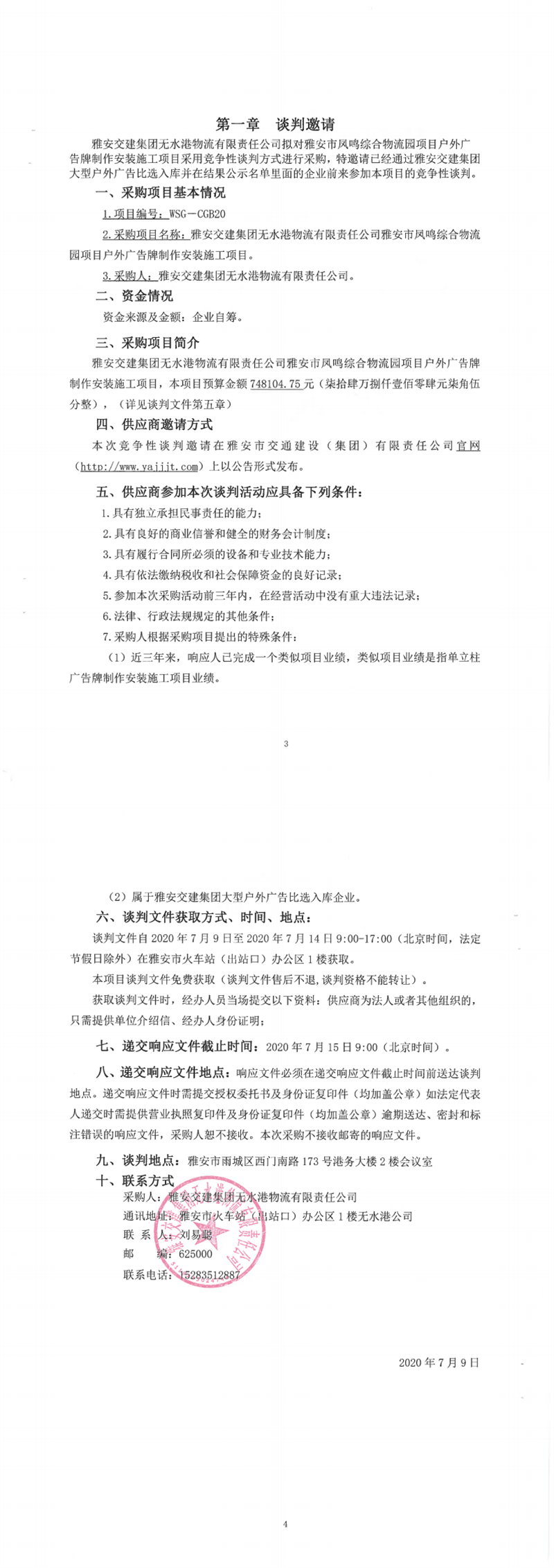 大红鹰dhy(中国)集团无水港物流有限责任公司雅安市凤鸣综合物流园项目户外广告牌制作安装施工项目竞争性谈判公告