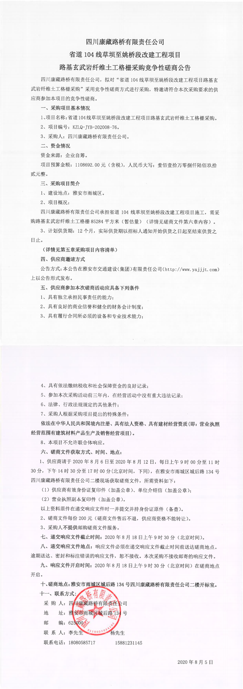 四川康藏路桥有限责任公司省道104线草坝至姚桥段改建工程项目路基玄武岩纤维土工格栅采购竞争性磋商公告