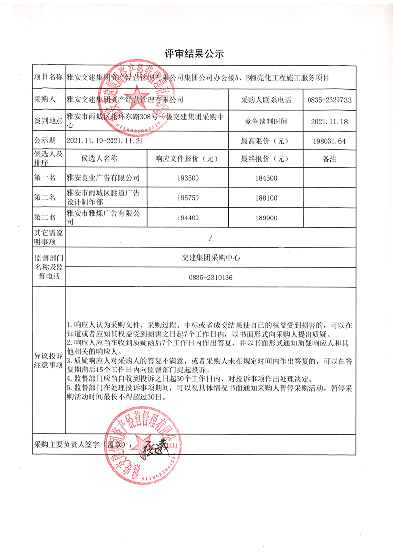 大红鹰dhy(中国)集团资产经营管理有限公司集团公司办公楼A、B幢亮化工程施工服务项目评审结果公示