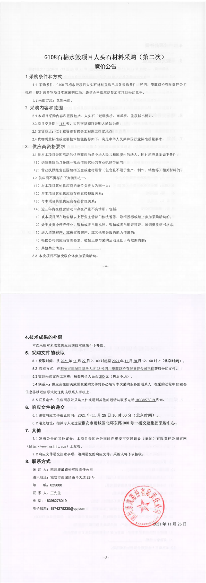 四川康藏路桥有限责任公司G108石棉水毁项目人头石材料采购(第二次)竞价公告
