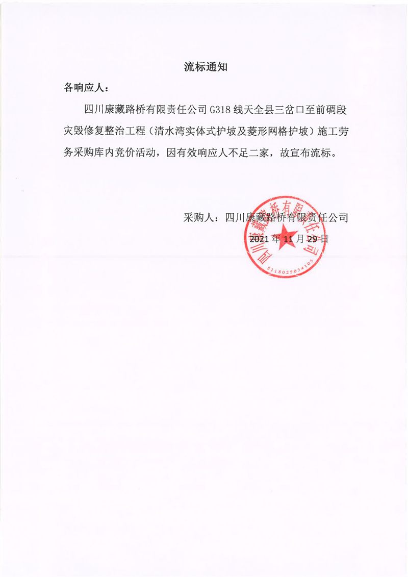 四川康藏路桥有限责任公司G318线天全县三岔口至前碉段灾毁修复整治工程(清水湾实体式护坡及菱形网格护坡)施工劳务采购流标通知
