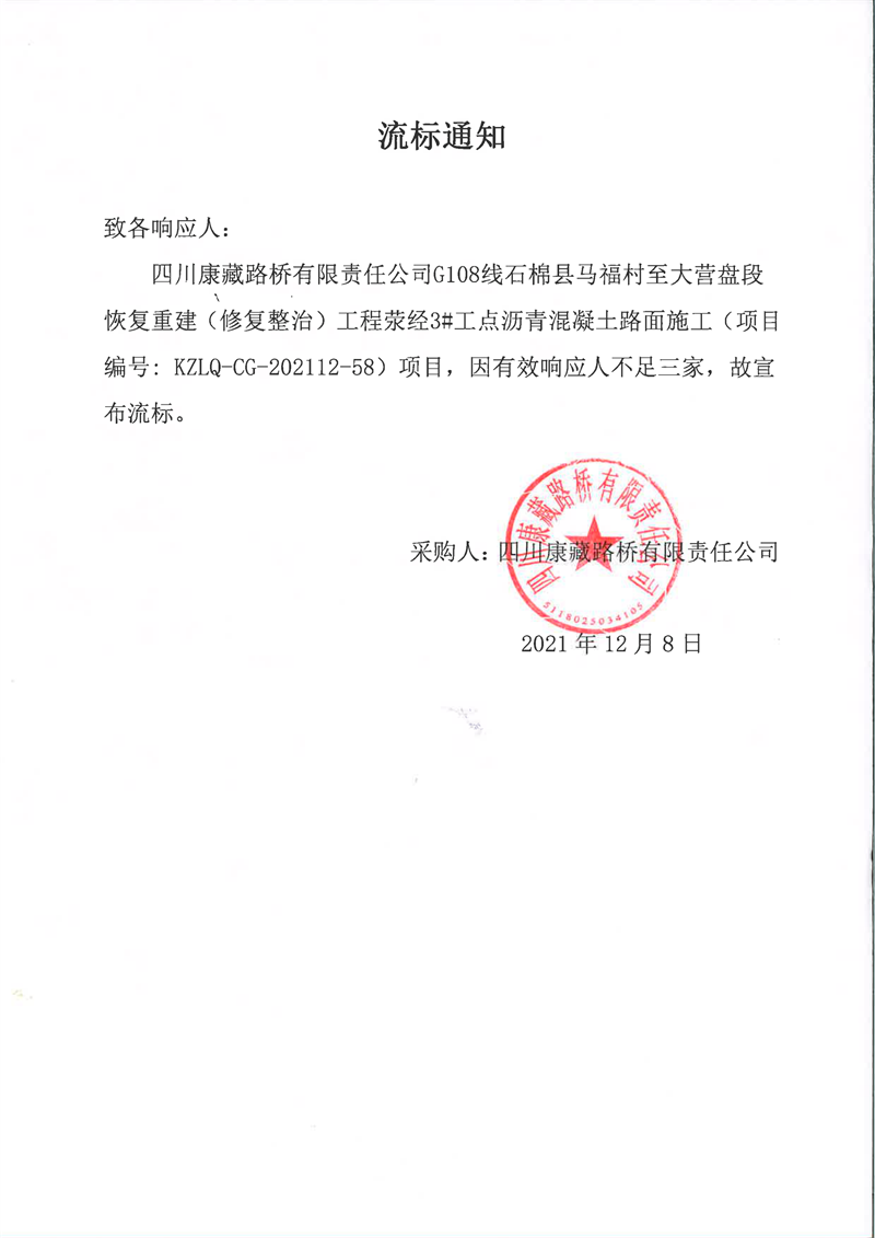 四川康藏路桥有限责任公司G108线石棉县马福村至大营盘段恢复重建(修复整治)工程荥经3#工点沥青混凝土路面施工流标通知