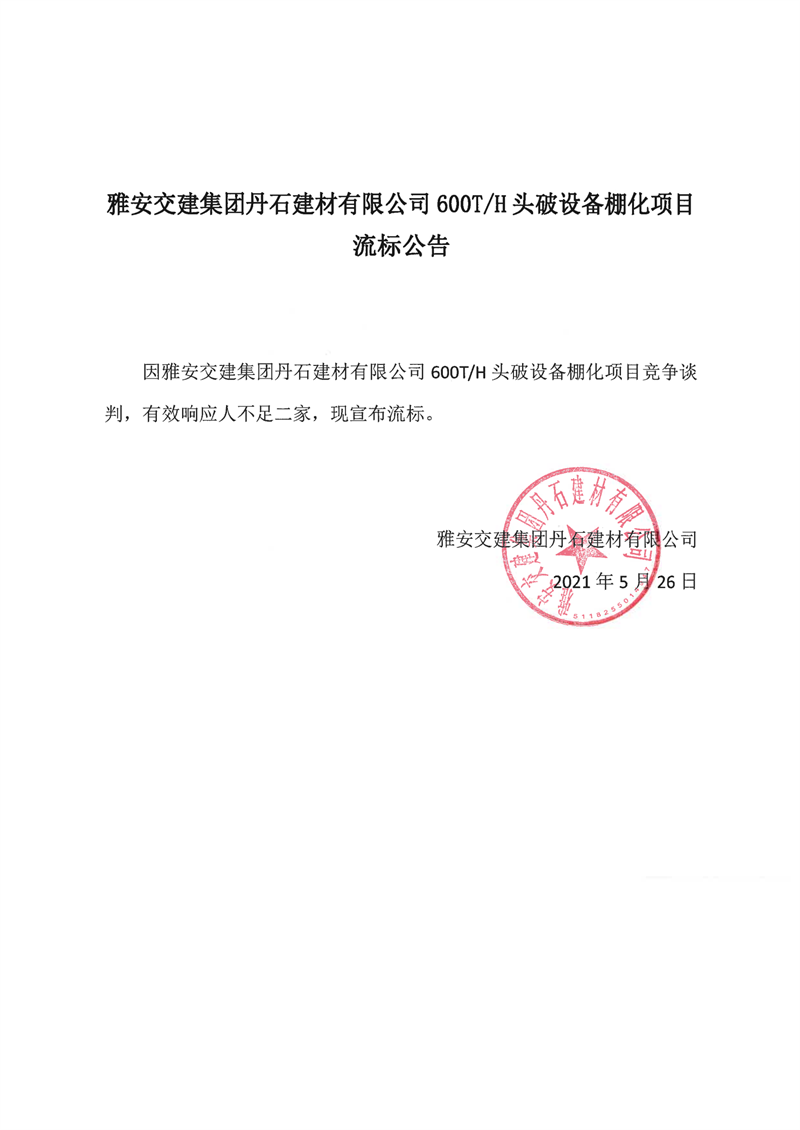 大红鹰dhy(中国)集团丹石建材有限公司600T/H头破设备棚化项目流标公告