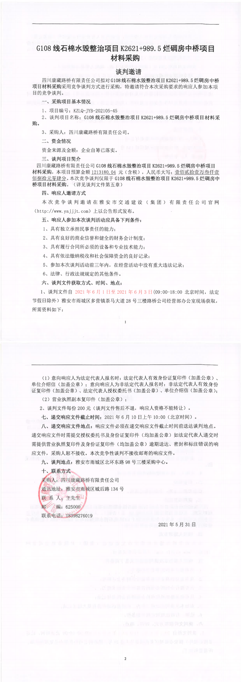 四川康藏路桥有限责任公司G108线石棉水毁整治项目K2621+989.5烂碉房中桥项目材料采购竞争谈判公告