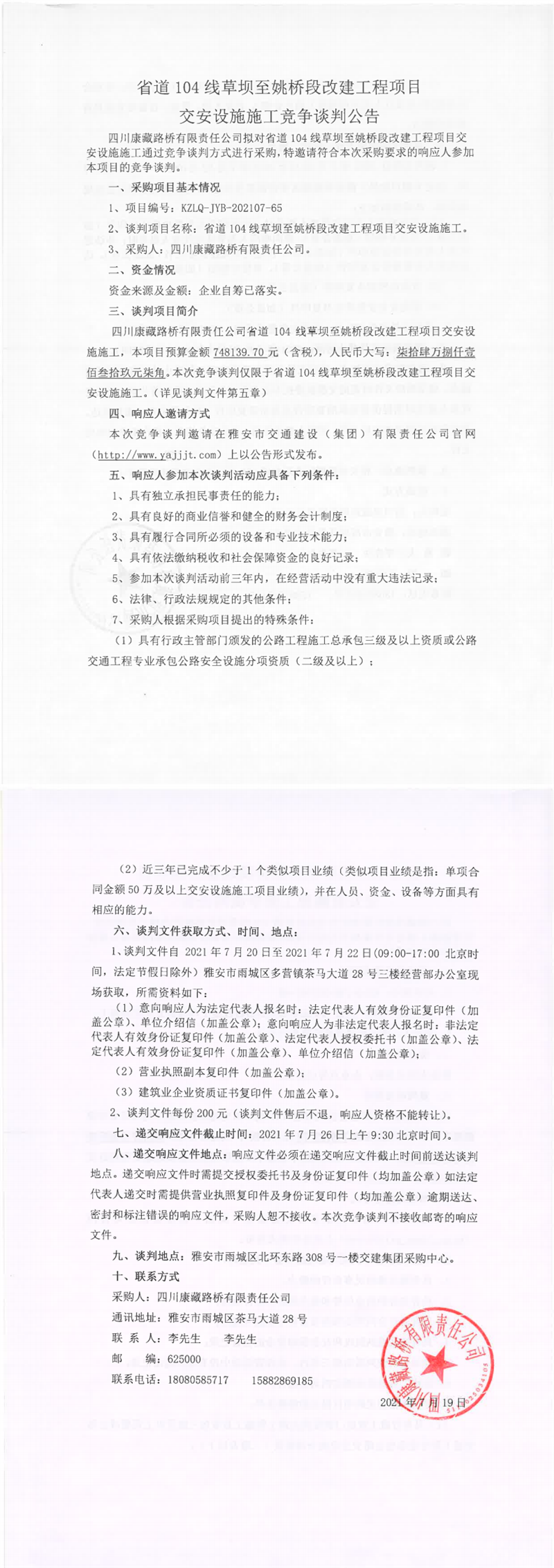 四川康藏路桥有限责任公司省道104线草坝至姚桥段改建项目交安设施施工竞争谈判公告