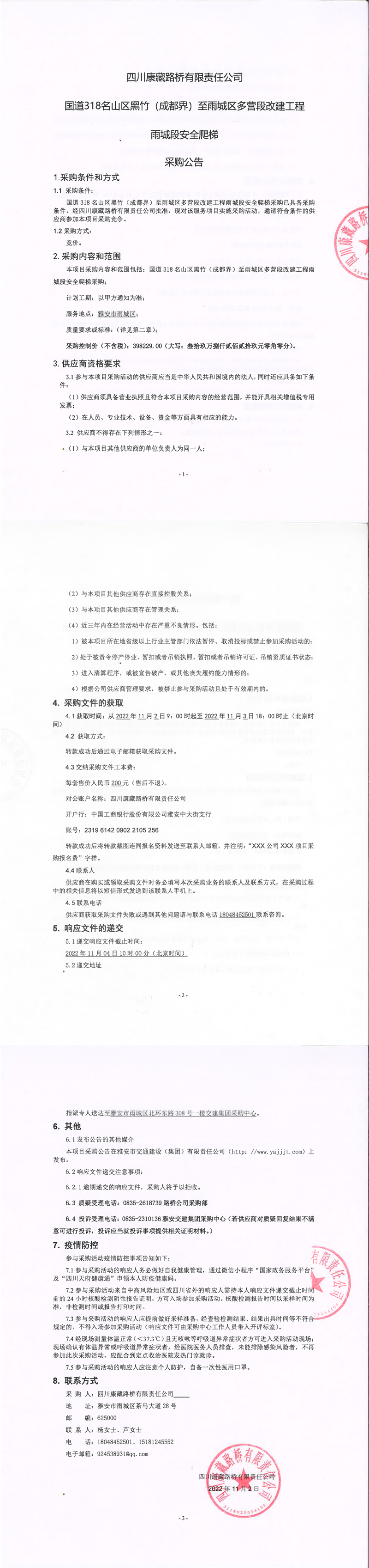 四川康藏路桥有限责任公司国道318名山区黑竹(成都界)至雨城区多营段改建工程雨城段安全爬梯采购公告