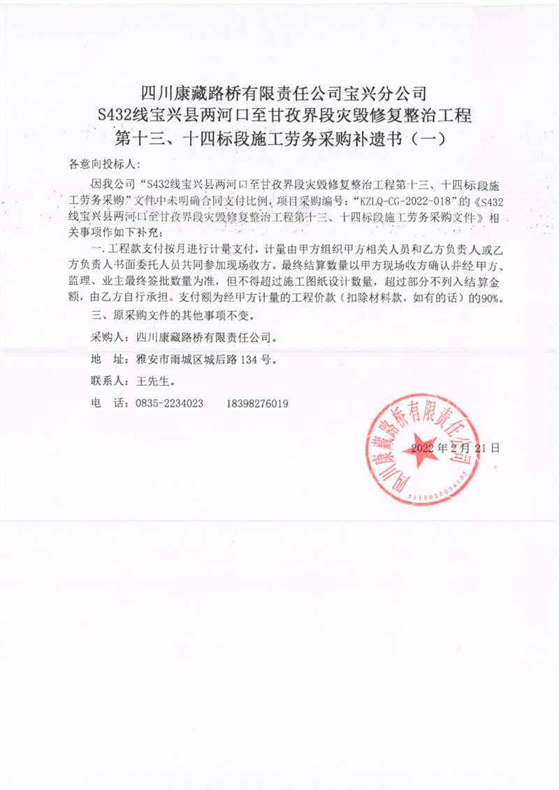 四川康藏路桥有限责任公司宝兴分公司S432线宝兴县两河口至甘孜界段灾毁修复整治工程第十三、十四标段施工劳务采购补遗书(一)