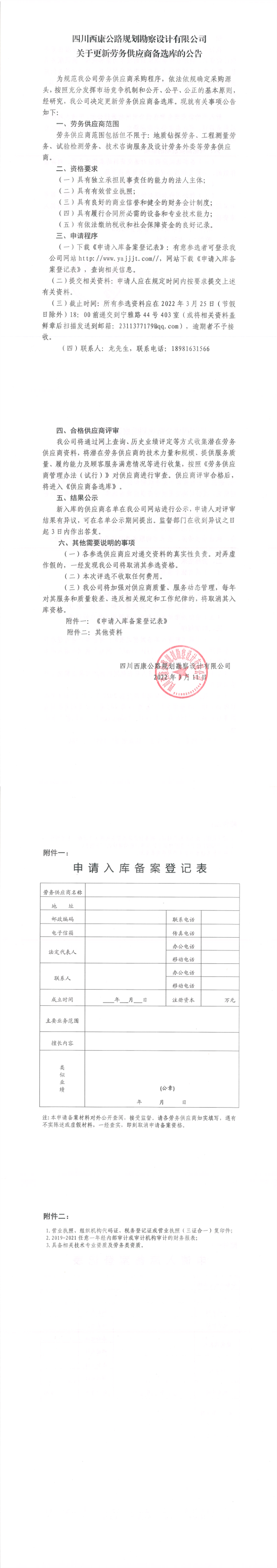 四川西康公路规划勘察设计有限公司关于更新劳务供应商备选库的公告