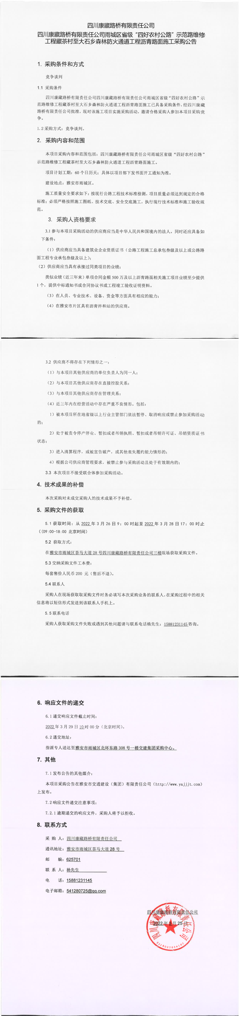 四川康藏路桥有限责任公司雨城区省级“四好农村公路”示范路维修工程藏茶村至大石乡森林防火通道工程沥青路面施工采购公告