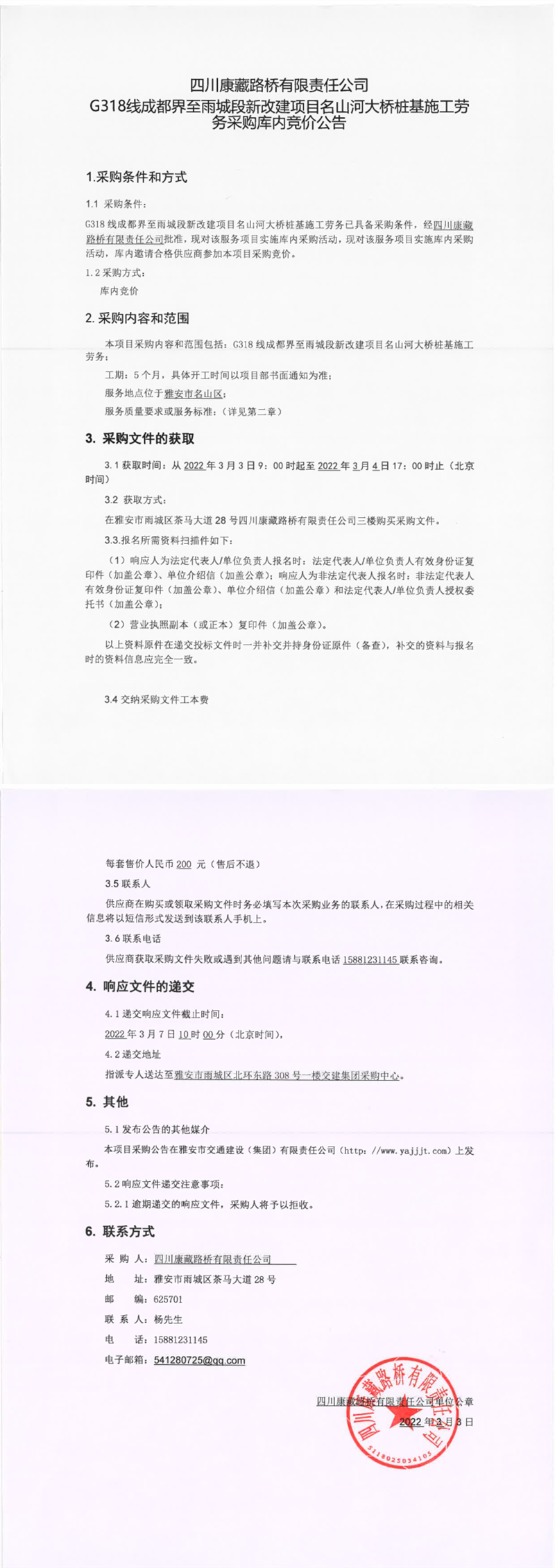 四川康藏路桥有限责任公司G318线成都界至雨城段新改建项目名山河大桥桩基施工劳务采购库内竞价公告