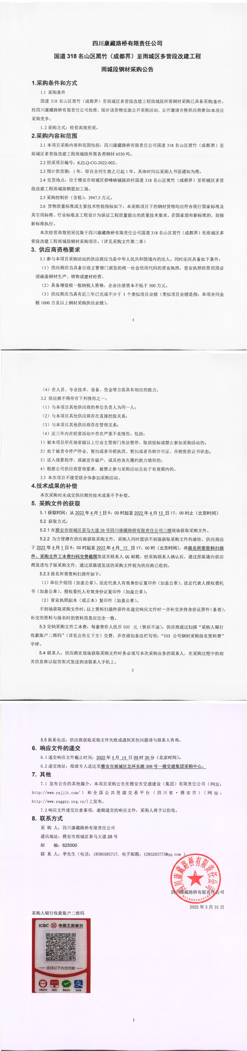 四川康藏路桥有限责任公司国道318名山区黑竹(成都界)至雨城区多营段改建工程雨城段钢材采购公告