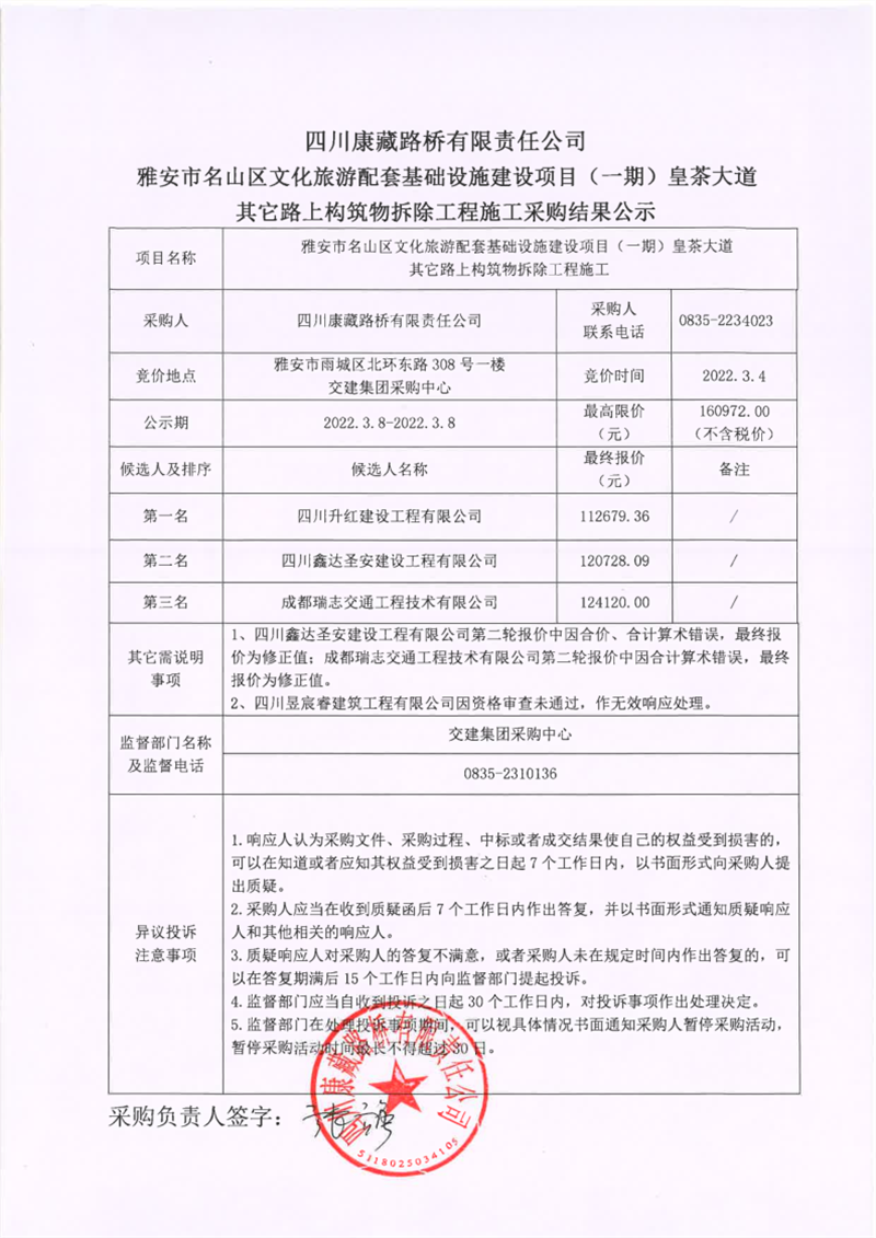 四川康藏路桥有限责任公司雅安市名山区文化旅游配套基础设施建设项目(一期)皇茶大道其它路上构筑物拆除工程施工采购结果公示