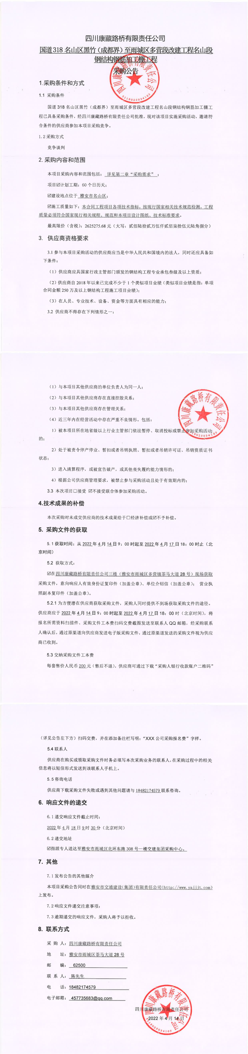四川康藏路桥有限责任公司国道318名山区黑竹(成都界)至雨城区多营段改建工程名山段钢结构钢筋加工棚工程采购公告