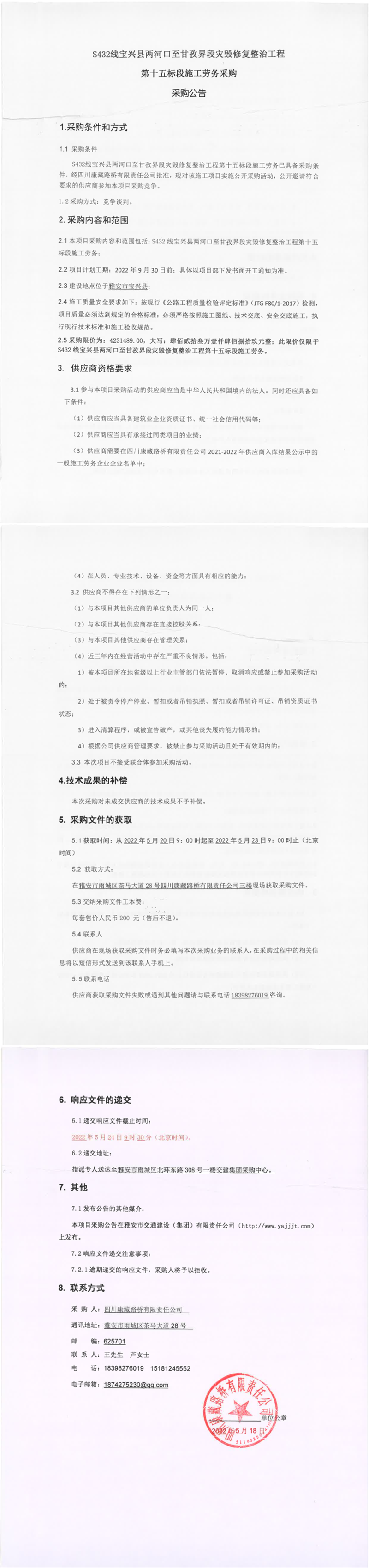 四川康藏路桥有限责任公司S432线宝兴县两河口至甘孜界段灾毁修复整治工程第十五标段施工劳务采购采购公告