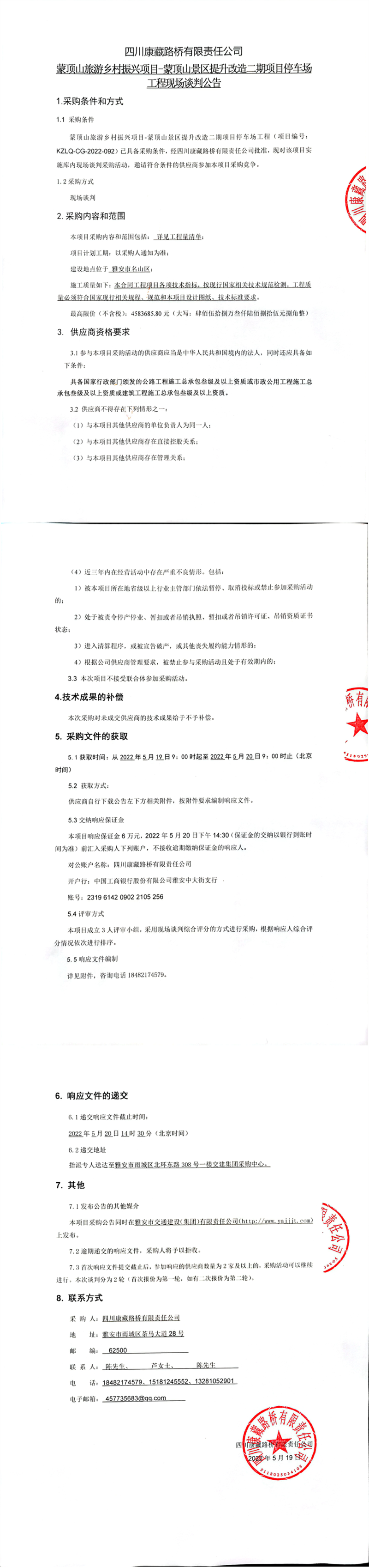 四川康藏路桥有限责任公司蒙顶山旅游乡村振兴项目-蒙顶山景区提升改造二期项目停车场工程现场谈判公告