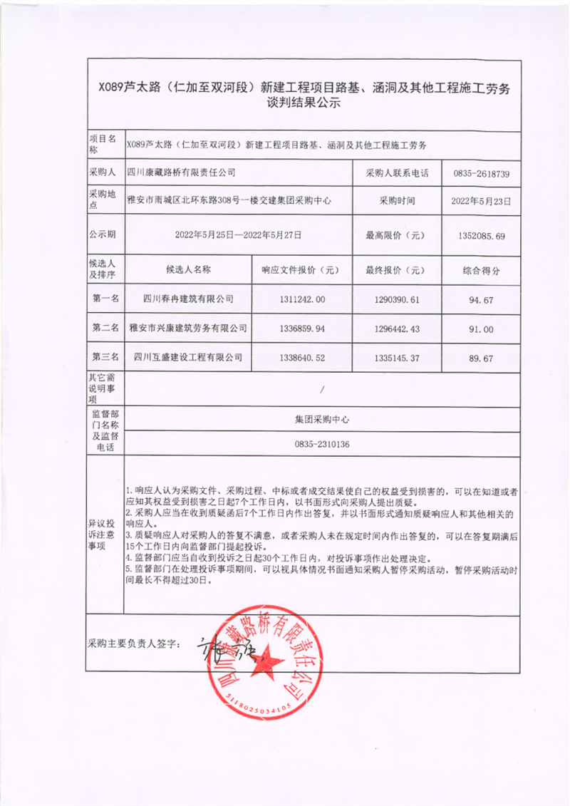 四川康藏路桥有限责任公司X089芦太路(仁加至双河段)新建工程项目路基、涵洞及其他工程施工劳务谈判结果公示