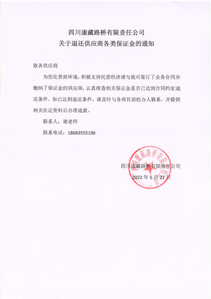 四川康藏路桥有限责任公司关于退还供应商各类保证金的通知