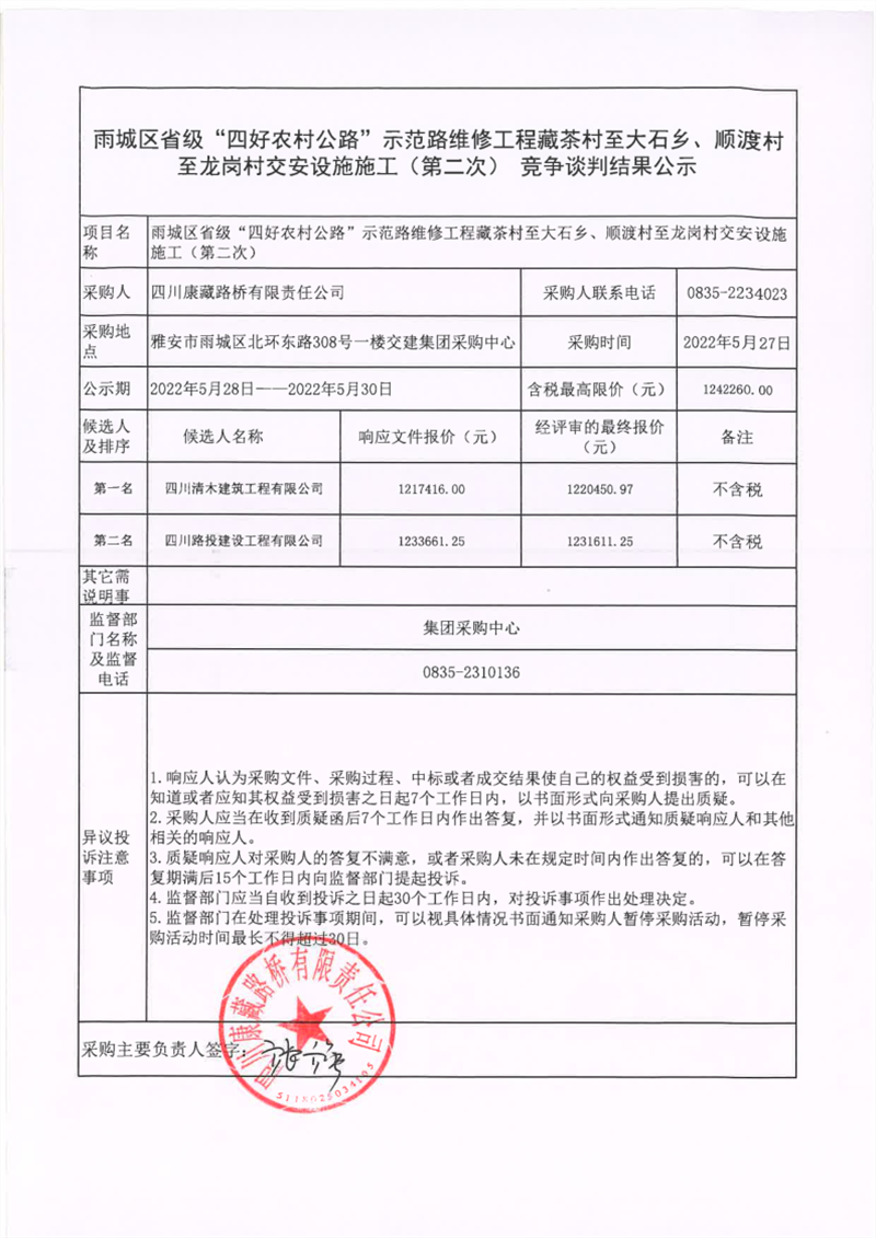 四川康藏路桥有限责任公司雨城区省级“四好农村公路”示范路维修工程藏茶村至大石乡、顺渡村至龙岗村交安设施施工(第二次)竞争谈判结果公示