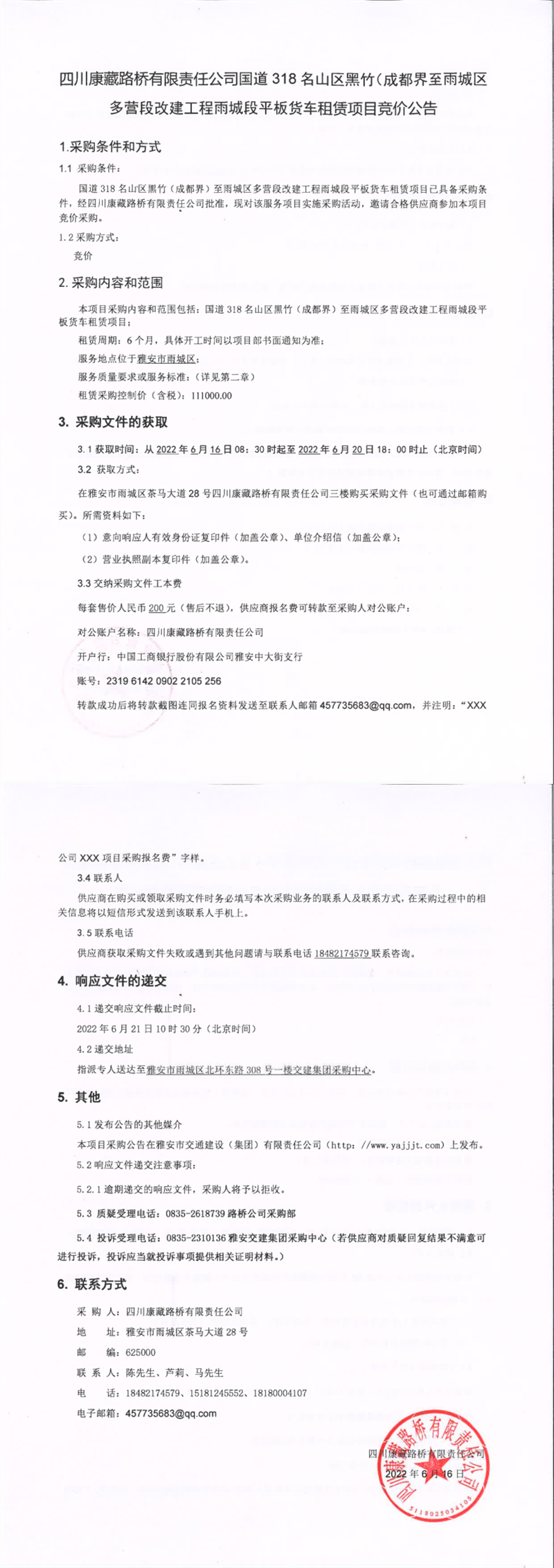 四川康藏路桥有限责任公司国道318名山区黑竹(成都界)至雨城区多营段改建工程雨城段平板货车租赁项目竞价公告