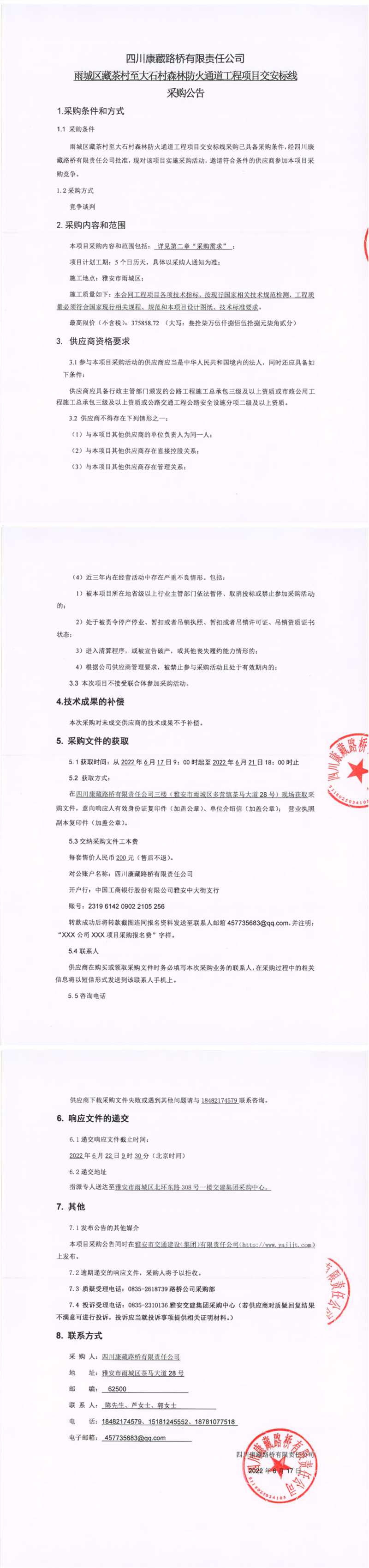 四川康藏路桥有限责任公司雨城区藏茶村至大石村森林防火通道工程项目交安标线采购公告