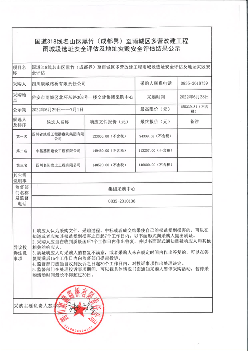 四川康藏路桥有限责任公司国道318名山区黑竹(成都界)至雨城区多营段改建工程雨城段选址安全评估及地址灾毁安全评估结果公示