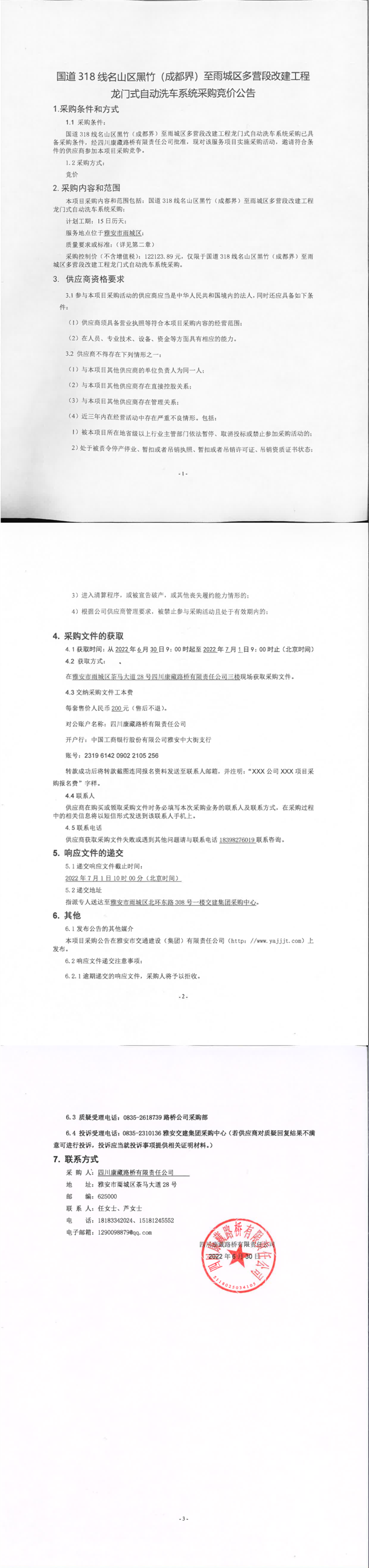 四川康藏路桥有限责任公司国道318名山区黑竹(成都界)至雨城区多营段改建工程龙门式自动洗车系统采购竞价公告