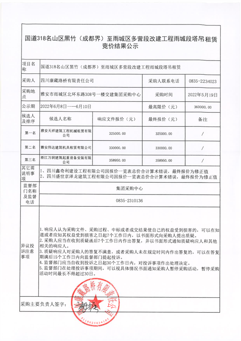 四川康藏路桥有限责任公司国道318名山区黑竹(成都界)至雨城区多营段改建工程雨城段塔吊租赁竞价结果公示