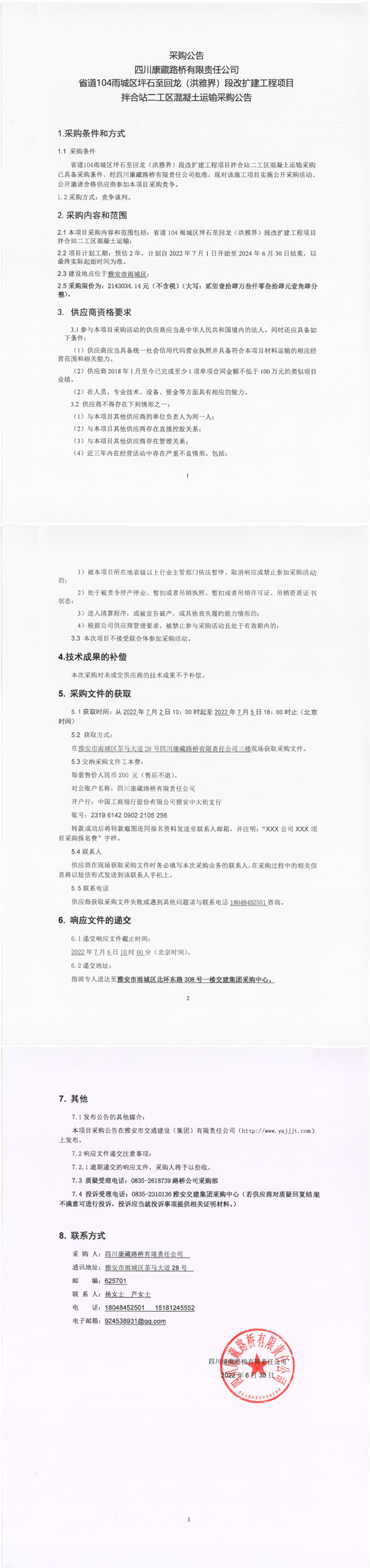 四川康藏路桥有限责任公司省道104雨城区坪石至回龙(洪雅界)段改扩建工程项目拌合站二工区混凝土运输采购公告