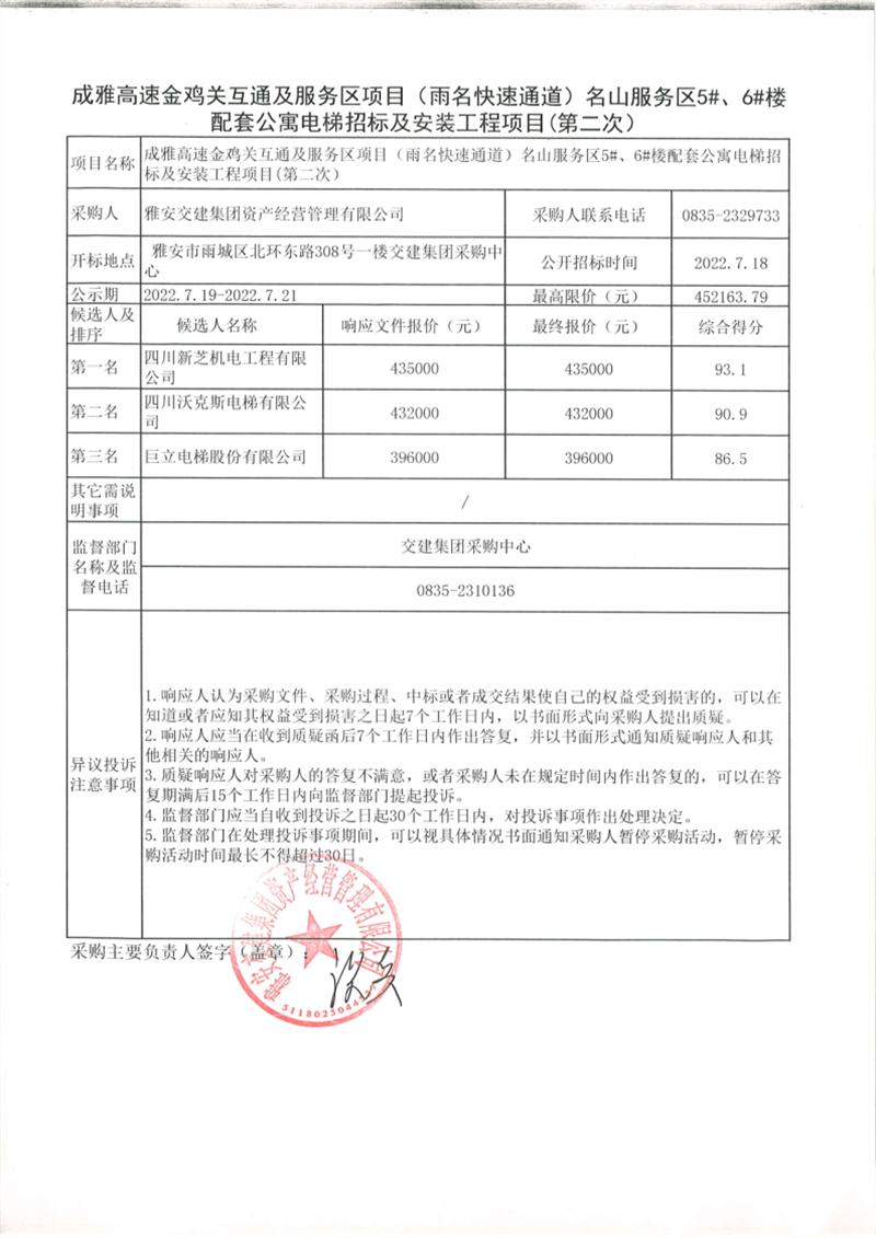 大红鹰dhy(中国)集团资产经营管理有限公司成雅高速金鸡关互通及服务区项目(雨名快速通道)名山服务区5#、6#楼配套公寓电梯招标及安装工程项目招标公告(第二次)结果公示
