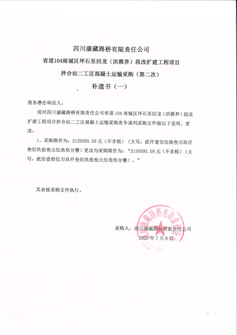 四川康藏路桥有限责任公司省道104线雨城区坪石至回龙(洪雅界)段改建工程项目拌合站二工区混凝土运输采购(第二次)补遗书(一)