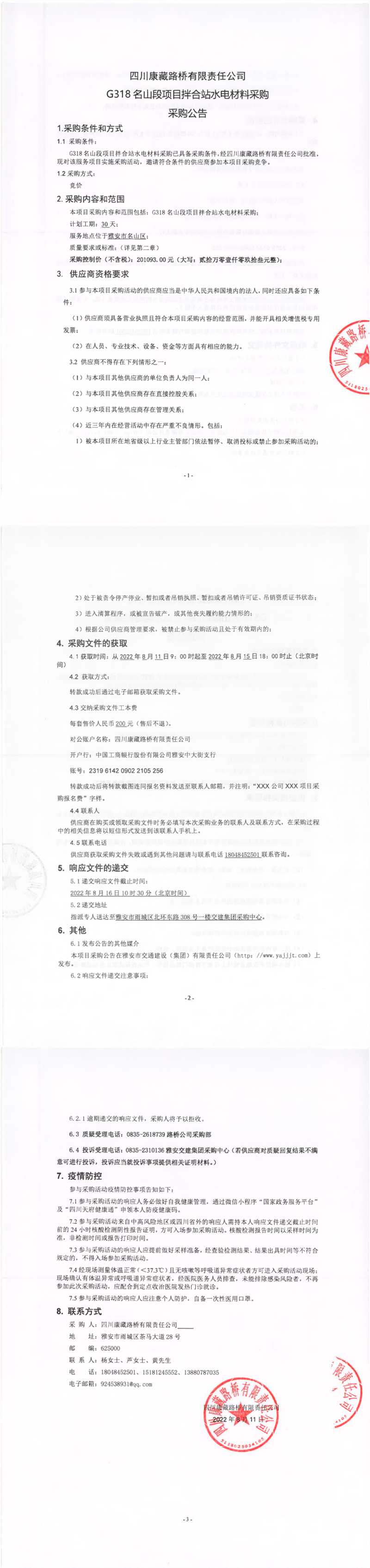 四川康藏路桥有限责任公司G318名山段项目拌合站水电材料采购采购公告