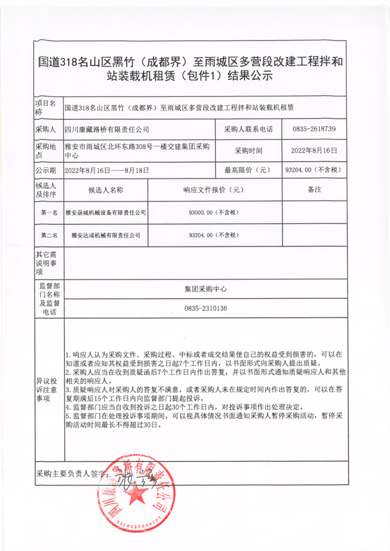四川康藏路桥有限责任公司国道318名山区黑竹(成都界)至雨城区多营段改建工程拌和站装载机租赁(包件1)结果公示