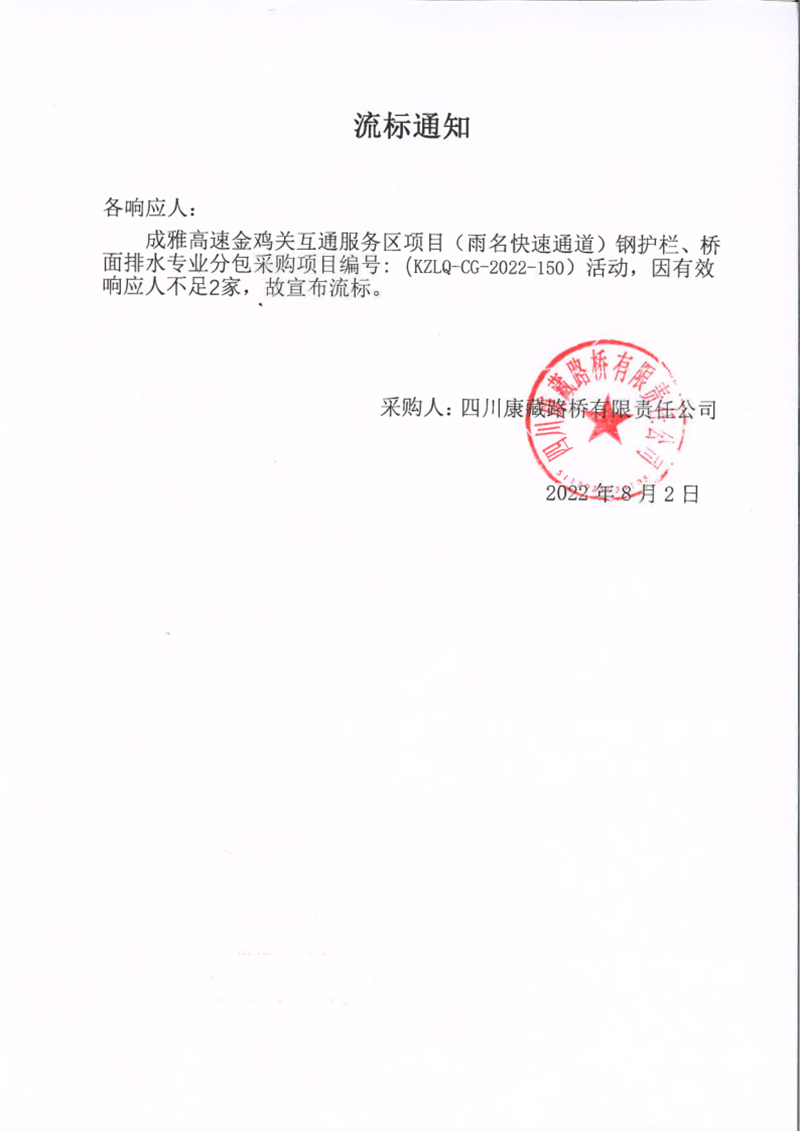 四川康藏路桥有限责任公司成雅高速金鸡关互通服务区项目(雨名快速通道)钢护栏、桥面排水专业分包采购项目流标通知