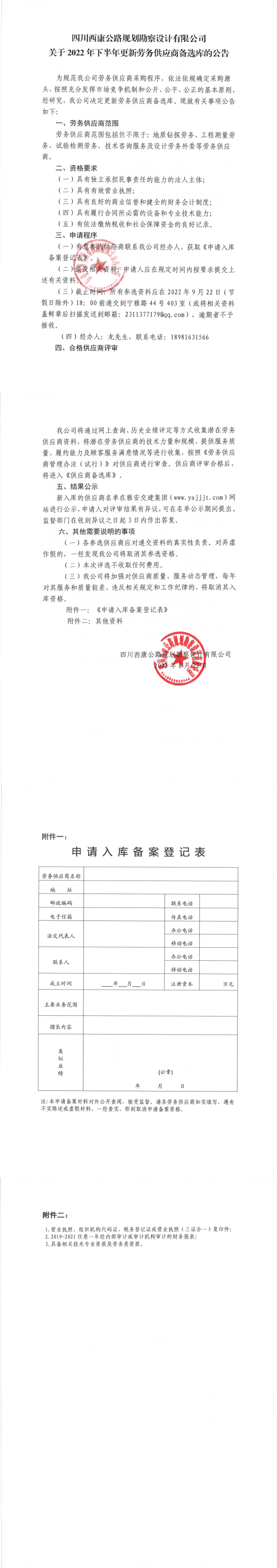 四川西康公路规划勘察设计有限公司关于2022年下半年更新劳务供应商备选库的公告