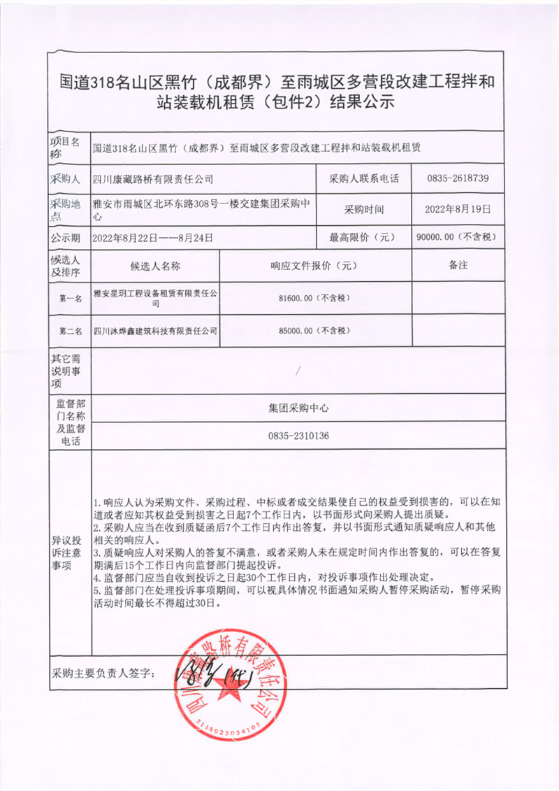 四川康藏路桥有限责任公司国道318名山区黑竹(成都界)至雨城区多营段改建工程拌和站装载机租赁(包件2)结果公示