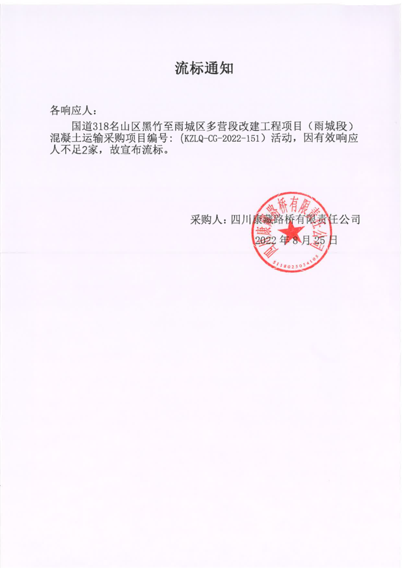 四川康藏路桥有限责任公司国道318名山区黑竹至雨城区多营段改建工程项目(雨城段)混凝土运输采购项目流标通知