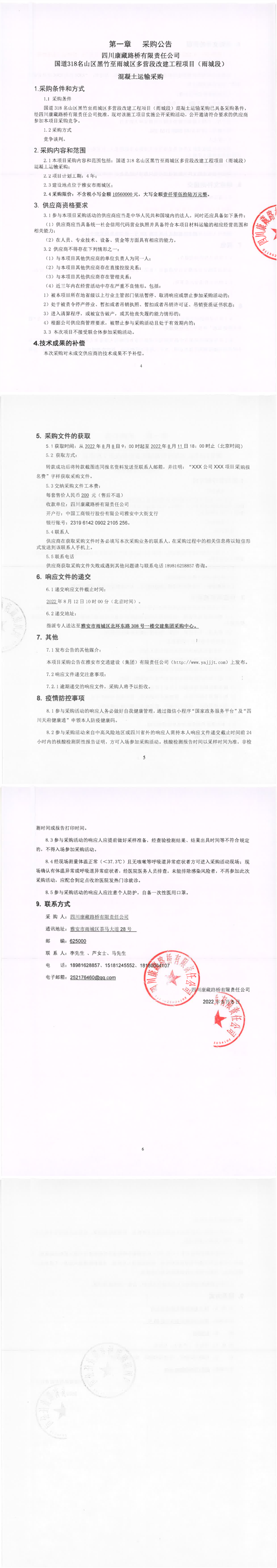 四川康藏路桥有限责任公司国道318名山区黑竹至雨城区多营段改建工程项目(雨城段)混凝土运输采购公告