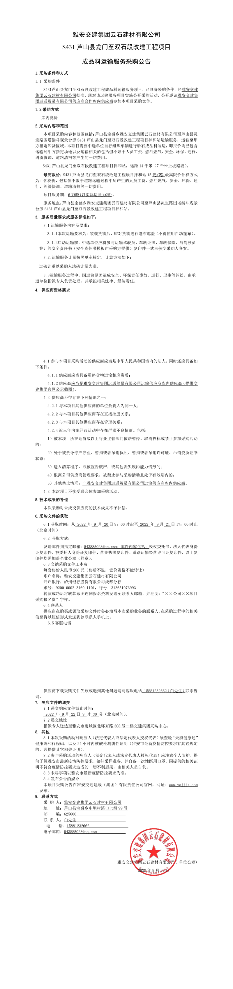大红鹰dhy(中国)集团云石建材有限公司S431芦山县龙门至双石段改建工程项目成品料运输服务采购公告