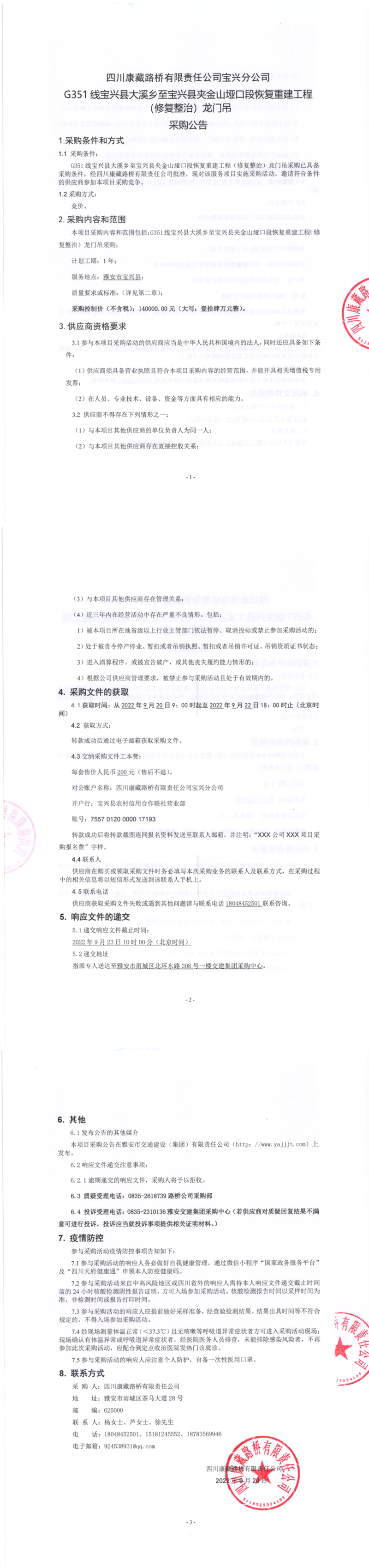 四川康藏路桥有限责任公司宝兴分公司G351大溪乡至宝兴县夹金山垭口段恢复重建工程(修复整治)龙门吊采购公告