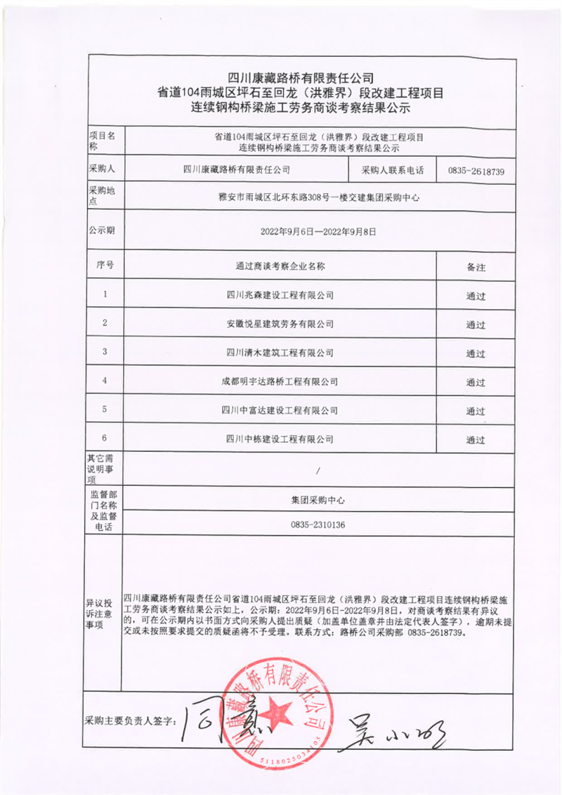 四川康藏路桥有限责任公司省道104雨城区坪石至回龙(洪雅界)段改建工程项目陆续在钢构桥梁施工劳务商谈考察结果公示