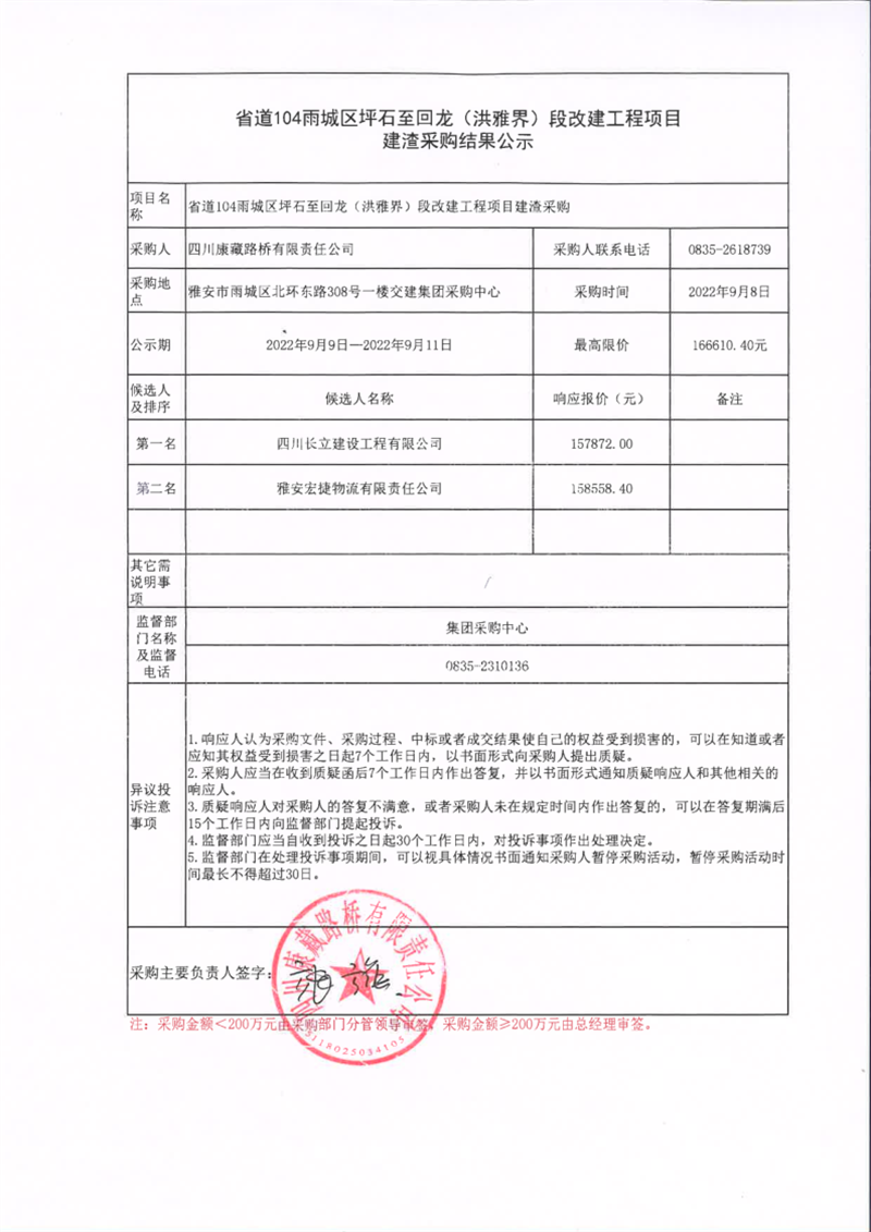 四川康藏路桥有限责任公司省道104雨城区坪石至回龙(洪雅界)段改建工程项目建渣采购结果公示
