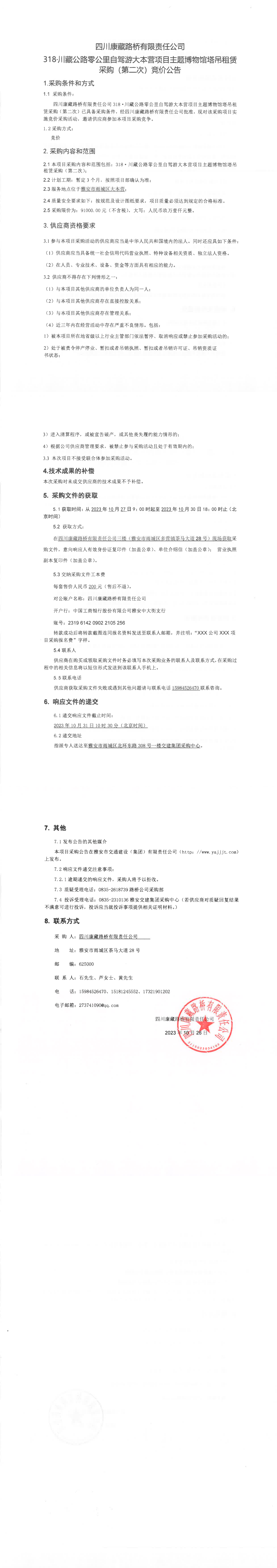 四川康藏路桥有限责任公司318·川藏公路零公里自驾游大本营项目主题博物馆塔吊租赁(第二次)采购竞价公告