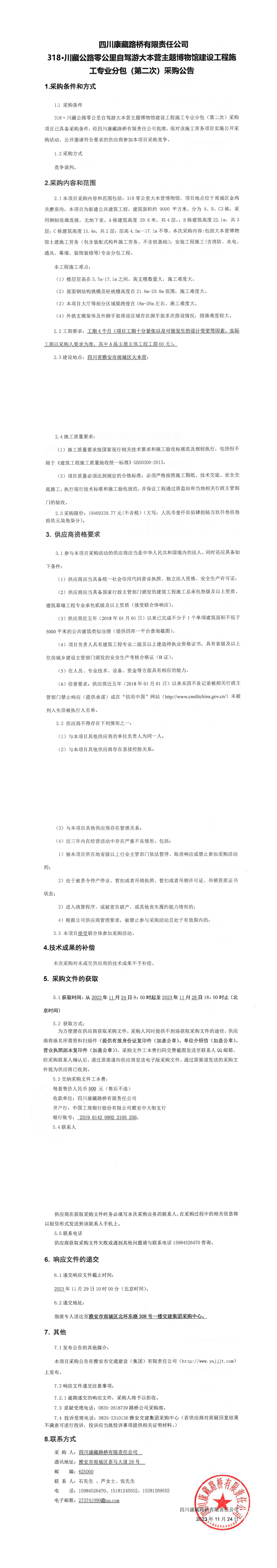 四川康藏路桥有限责任公司318·川藏公路零公里自驾游大本营主题博物馆建设工程施工专业分包(第二次)采购公告